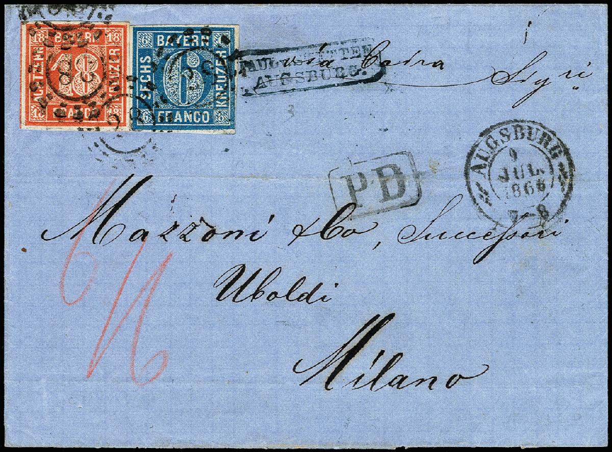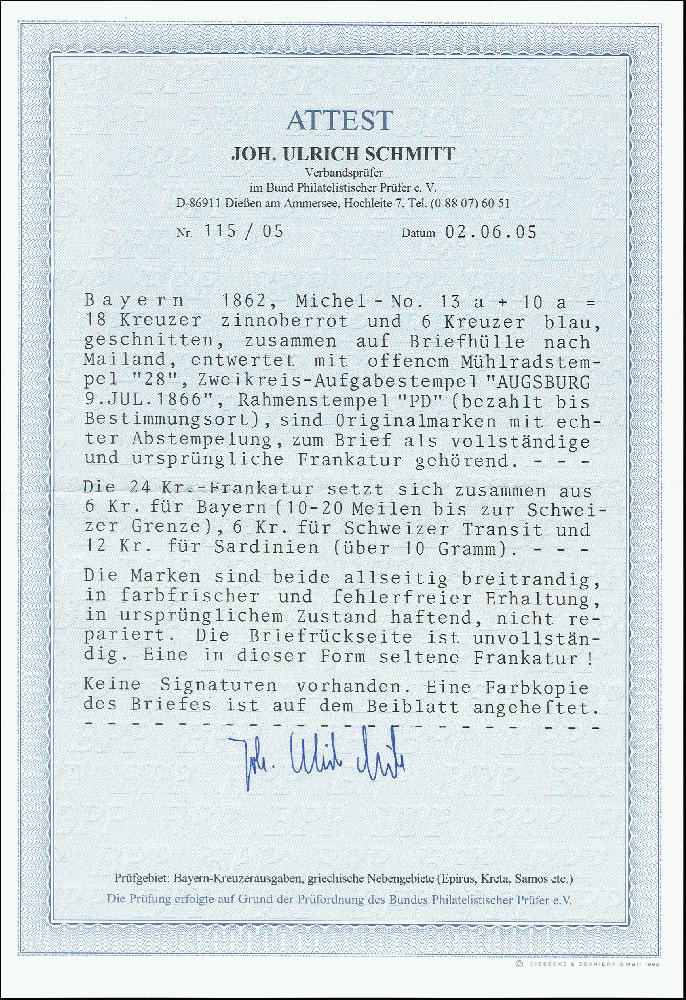 | Zusatzinformationen und Suchstichworte: | 371. Auktion Heinrich Köhler 24.-28. September 2019 Los 8204 1862, 18 Kreuzer zinnoberrot und 6 Kreuzer blau, farbfrisch und voll- bis meist breitrandig mit insgesamt viermal aufgesetztem oMR "28" sowie übergehendem Absenderstempel mit sauber nebengesetztem DKr. "AUGSBURG 9 JUL. 1866" auf Briefhülle (untere Seitenklappe fehlend) über die Schweiz nach Mailand. Der Brief war portogerecht frankiert für die 1. deutsche und 2. italienische Gewichtsstufe mit 9 Kreuzern Vereinsporto, 6 Kreuzern Schweizer Transit und 12 Kreuzern italienischem Porto, vorderseitig jedoch nur "6/6" Kreuzer Schweizer Transit und italienisches Porto als Weiterfranko notiert. Ein schöner Brief mit seltener Frankaturkombination; Fotoattest Schmitt BPP (2005) Zuschlag 900,00 EUR |