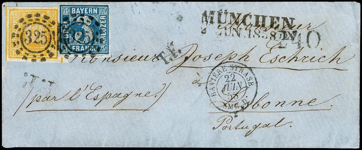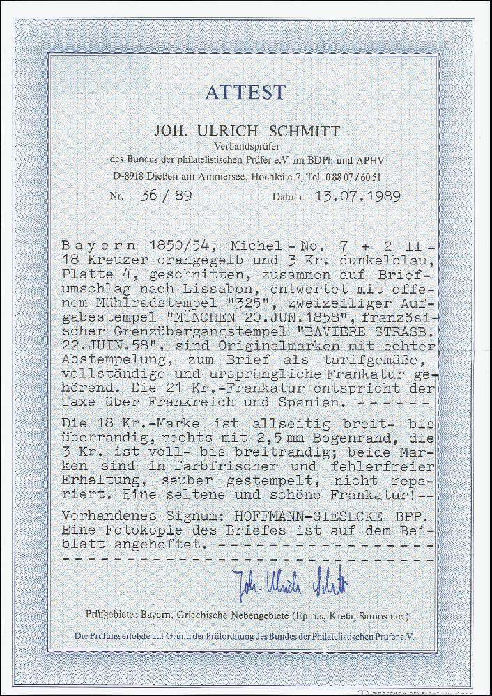 | Zusatzinformationen und Suchstichworte: | 371. Auktion Heinrich Köhler 24.-28. September 2019 Los 8213 PORTUGAL: 18 Kreuzer gelborange, breit- bis überrandig, rechts mit 2,5 mm Bogenrand, zusammen mit voll- bis breitrandiger 3 Kreuzer blau, Platte 4, beide farbfrisch und sehr schön entwertet durch sauber aufgesetztem oMR "325" auf kleinem Briefkuvert von "MÜNCHEN 20 JUN. 1858" über Frankreich und Spanien im geschlossenen Briefpaket nach Lissabon. Eine außerordentlich attraktive und sehr seltene 21 Kreuzer-Frankatur, es sind nur wenige Briefe der Quadratausgabe nach Portugal bekannt, signiert Hoffmann-Giesecke BPP und Fotoattest Schmidt BPP (1989) Zuschlag 8.000,00 EUR |