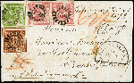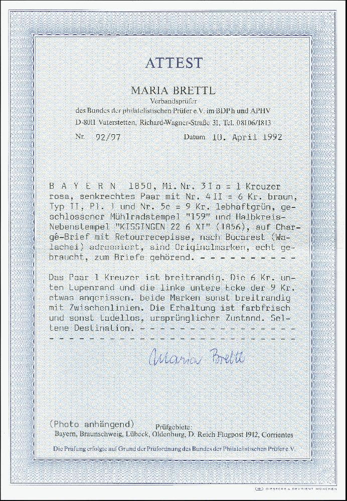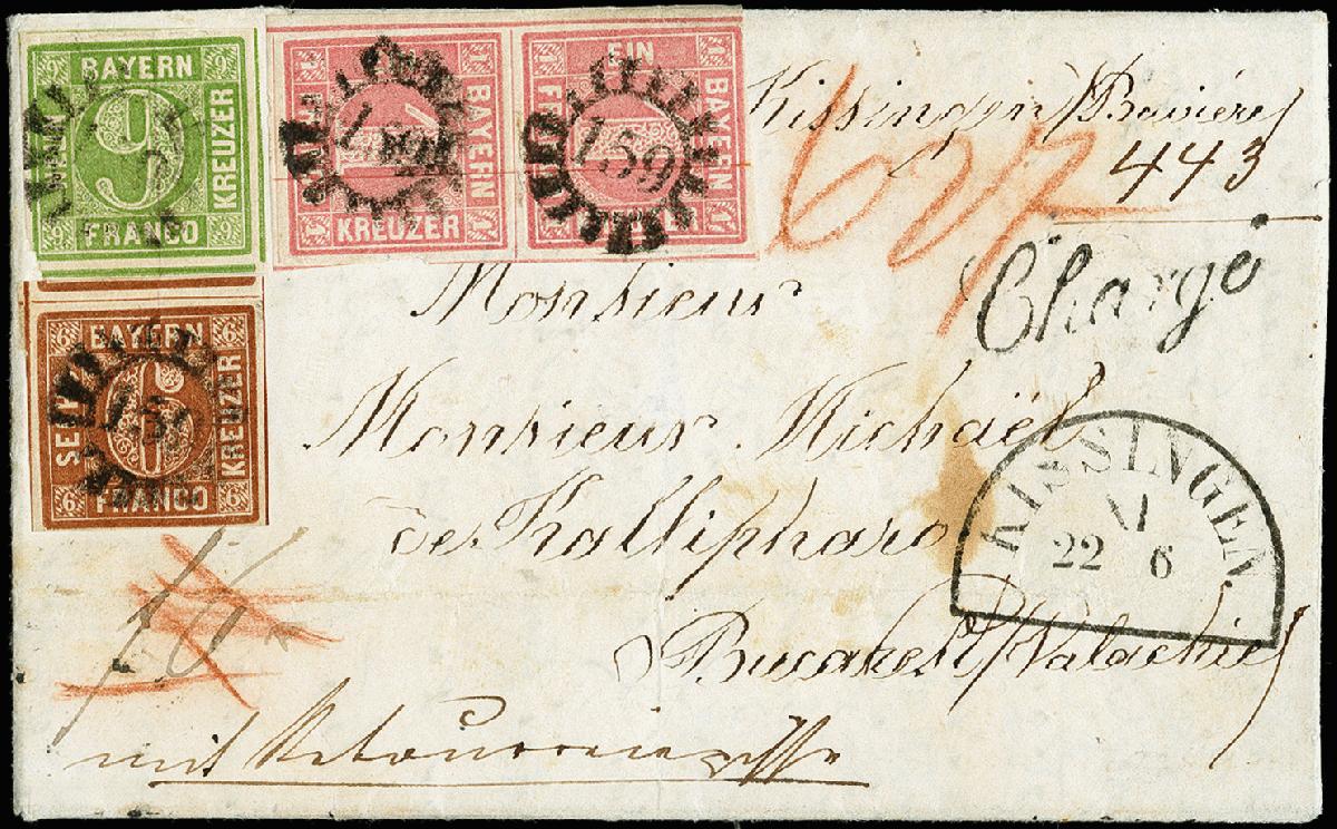 | Zusatzinformationen und Suchstichworte: | 371. Auktion Heinrich Köhler 24.-28. September 2019 Los 8214 RUMÄNIEN: 1850/58, 1 Kreuzer rosa im senkrechten Paar, 6 Kreuzer braun und 9 Kreuzer maigrün, letztere in der linken unteren Ecke berührt, die 6 Kreuzer unten lupenrandig, sonst alle voll- bis breitrandig und farbfrisch, mit gMR "159" und sauber nebengesetztem Halbkreis "KISSINGEN 22 6" (1856) auf komplettem Chargé-Brief "mit Retourrecepisse" nach Bukarest in der Walachei. Das Porto setzt sich zusammen aus 9 Kreuzern Vereinsporto und 8 Kreuzern (= 6 Kreuzer CM) Weiterfranko, dazu kamen 12 Kreuzer für das Einschreiben und die Retourrecepisse, das in bar verrechnet wurde. Ein attraktiver und außerordentlich seltener Brief in sehr schöner Erhaltung. Fotoattest Brettl BPP (1992) Zuschlag 3.600,00 EUR |
