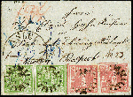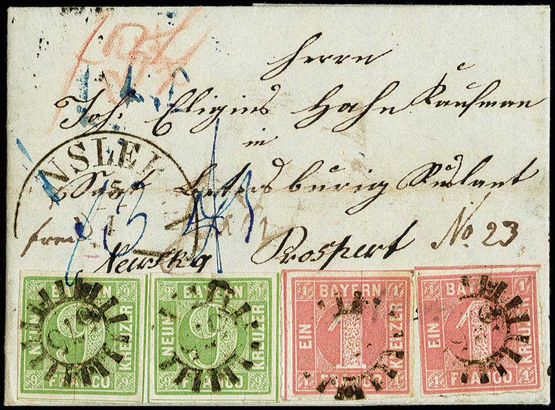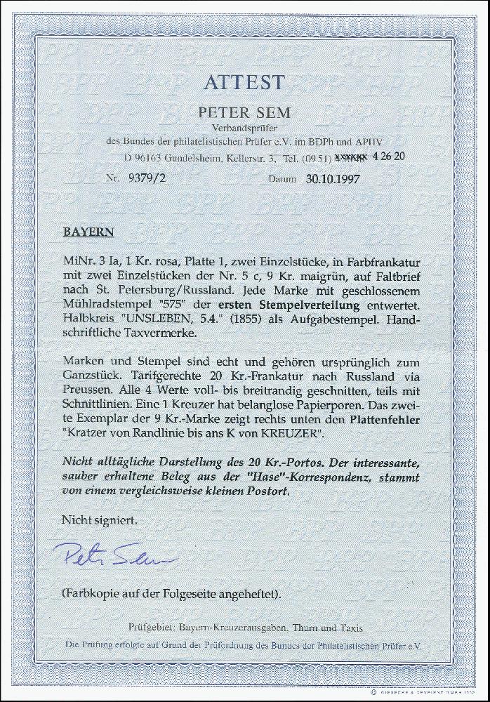 | Zusatzinformationen und Suchstichworte: | 371. Auktion Heinrich Köhler 24.-28. September 2019 Los 8216 RUSSLAND: 1850/58, 1 Kreuzer rosa und 9 Kreuzer maigrün, je 2 Einzelwerte, dabei eine 9 Kreuzer mit Plattenfehler "Kratzer von Randlinie bis ans K", alle farbfrisch und voll- bis breitrandig mit gMR "575" und nebengesetztem Halbkreis "UNSLEBEN 5/4" (1855) auf komplettem kleinen Faltbrief nach St. Petersburg mit rückseitigem Ankunftsstempel; das Weiterfranko als "3" Silbergroschen vorder- und rückseitig vermerkt. Einwandfreie Erhaltung. Ein attraktiver Brief mit seltener Darstellung des 20 Kreuzer-Portos. Fotoattest Sem BPP (1997) Zuschlag 1.350,00 EUR |