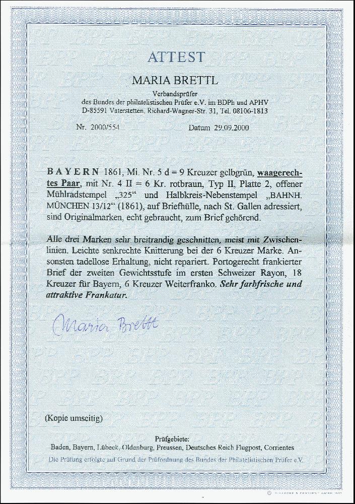 | Zusatzinformationen und Suchstichworte: | 371. Auktion Heinrich Köhler 24.-28. September 2019 Los 8222 1850/58, 9 Kreuzer gelbgrün im waagerechten Paar zusammen mit 6 Kreuzer braun, alle sehr breitrandig und farbfrisch, mit oMR "325" und nebengesetztem Halbkreis "BAHNH. MÜNCHEN 13/12" (1861) auf Briefhülle der 2. Gewichtsstufe nach St. Gallen, portogerecht frankiert mit 18 Kreuzern Vereinsporto und 6 Kreuzern Weiterfranko; die 6 Kreuzer ganz leichte Knitterung, sonst einwandfrei. Ein attraktiver Brief mit recht seltener Frankaturkombination. Fotoattest Brettl BPP (2000) Zuschlag 420,00 EUR |