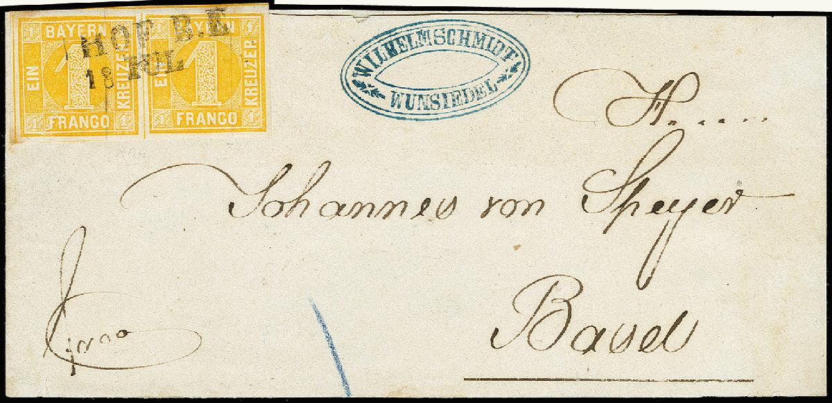 | Zusatzinformationen und Suchstichworte: | 371. Auktion Heinrich Köhler 24.-28. September 2019 Los 8224 1862, 1 Kreuzer gelb im waagerechten Paar, allseits breitrandig und sehr schön farbfrisch mit sauber aufgesetztem L2 "HOF B.E / 18 JUL." (1867) auf Drucksachenschleife nach Basel mit rückseitigem Schweizer Bahnpost- und Ankunftsstempel. Die linke Marke mit interessanter Druckzufälligkeit durch Haar auf der Platte und hier in den Ecken Gummi etwas bräunlich durchschlagend, sonst tadellose und sehr frische Erhaltung, signiert Pfenninger und Fotoattest Brettl BPP (1988) Zuschlag 220,00 EUR |