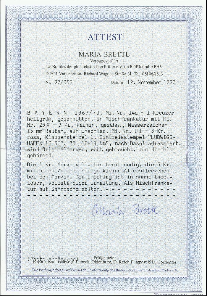 | Zusatzinformationen und Suchstichworte: | 371. Auktion Heinrich Köhler 24.-28. September 2019 Los 8228 1867, Wappen 1 Kreuzer hellgrün in Mischfrankatur mit gezähnter Ausgabe 3 Kreuzer karmin, Wasserzeichen X, als Zufrankatur auf Ganzsachenumschlag 3 Kreuzer rosa von "LUDWIGSHAFEN 13 SEP. 70" nach Basel; leichte Altersflecken bei der Frankatur und im Umschlag oben links, sonst einwandfrei. Eine attraktive und seltene Frankaturkombination; Fotoattest Brettl BPP (1992) Zuschlag 600,00 EUR |