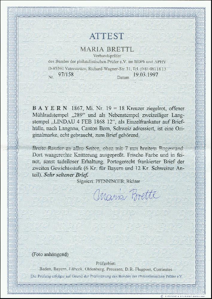 | Prüfer: | Brettl, Maria (BPP (Bund Philatelistischer Prüfer)) |