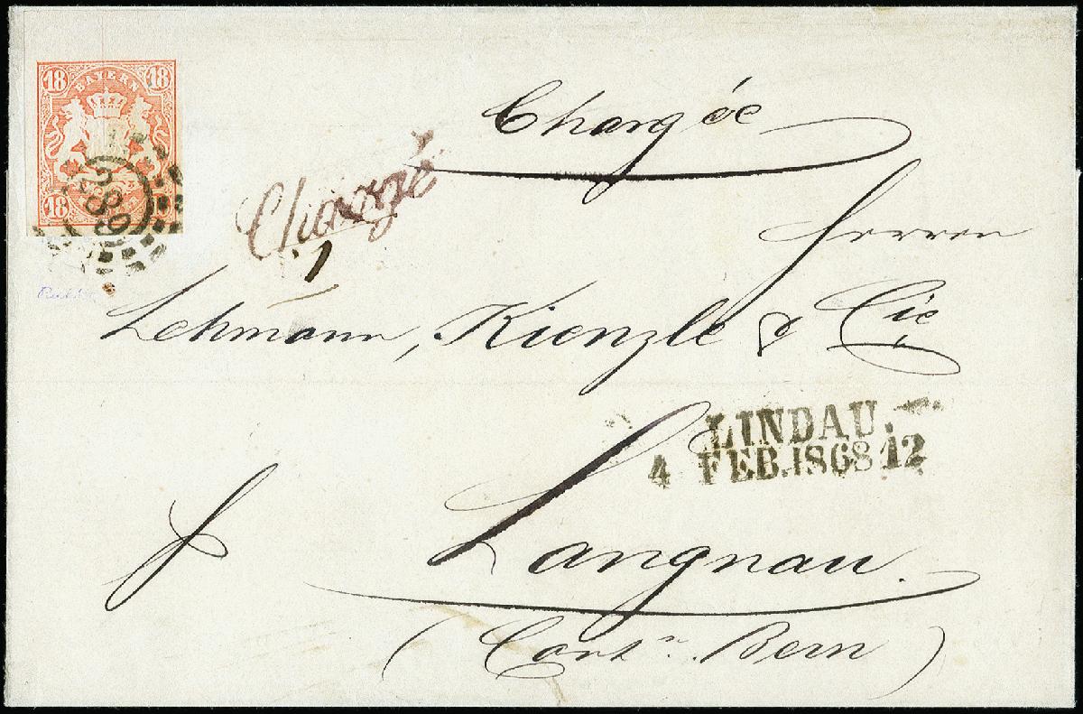 | Zusatzinformationen und Suchstichworte: | 371. Auktion Heinrich Köhler 24.-28. September 2019 Los 8230 1867, 18 Kreuzer ziegelrot, allseits breitrandiges Oberrandstück mit 7 mm Bogenrand, hier waagerechter Knitter geglättet mit sauberem oMR "289" und nebengesetztem L2 "LINDAU 4 FEB. 1868" auf Chargé-Briefhülle der 2. Gewichtsstufe nach Langnau im Kanton Bern, portogerecht frankiert mit 6 Kreuzern und 12 Kreuzern Weiterfranko. Leichte Papierbrüche in den Ecken der Hülle mit Falzen gestützt, sonst einwandfrei. Eine der schönsten Einzelfrankaturen dieser Marke; signiert Röhrl und Pfenninger sowie Fotoattest Brettl BPP (1997) Zuschlag 3.200,00 EUR |