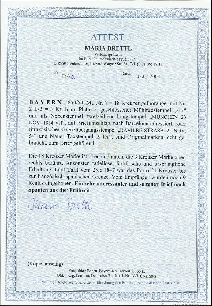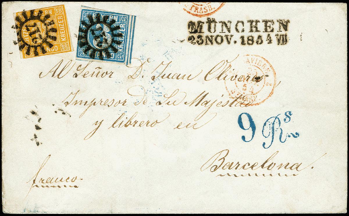 | Zusatzinformationen und Suchstichworte: | 371. Auktion Heinrich Köhler 24.-28. September 2019 Los 8233 SPANIEN: 1850/58, 18 Kreuzer gelborange, oben und unten berührt, sonst voll- bis breitrandig mit leicht berührter 3 Kreuzer blau, mit jeweils sauber aufgesetztem gMR "217" und sauber nebengesetztem L2 "MÜNCHEN 23 NOV. 1854" auf Briefkuvert nach Barcelona. Der Brief ist portogerecht frankiert nach dem Tarif vom 25.6.1847 und war bezahlt bis zur französisch-spanischen Grenze. Das spanische Inlandsporto in Höhe von "9 Rs." wurde vom Empfänger eingezogen. Ein attraktiver und sehr seltener früher Brief nach Spanien. Fotoattest Brettl BPP (2003) Ausruf 1.500,00 EUR |
