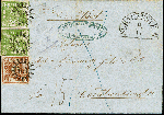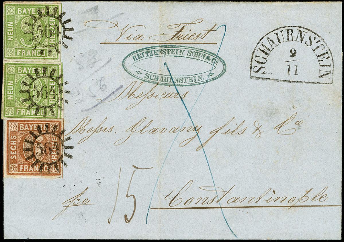 | Zusatzinformationen und Suchstichworte: | 371. Auktion Heinrich Köhler 24.-28. September 2019 Los 8234 TÜRKEI: 1850/58, 6 Kreuzer braun und 2 Einzelwerte 9 Kreuzer gelblichgrün in Type II und III, die Type III links berührt, sonst alle voll- bis breitrandig und farbfrisch mit jeweils glasklar aufgesetztem gMR "564" und nebengesetztem Halbkreis "SCHAUENSTEIN 9/11" (1855) auf Briefhülle mit Leitvermerk "Via Triest" nach Konstantinopel; nach dem Tarif vom 22.3.1854 portogerecht frankiert mit 9 Kreuzer Vereinsporto und 15 Kreuzer Weiterfranko. Ein attraktiver und seltener Brief in - besonders für diese Destination - sehr schöner Erhaltung. Fotoattest Brettl BPP (1999) Zuschlag 6.000,00 EUR |