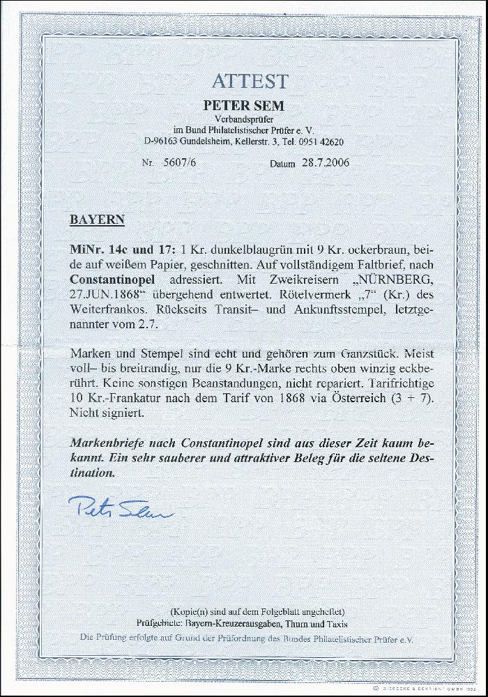 | Zusatzinformationen und Suchstichworte: | 371. Auktion Heinrich Köhler 24.-28. September 2019 Los 8235 1867, 1 Kreuzer dunkelblaugrün und 9 Kreuzer ockerbraun, letztere oben rechts etwas berührt, sonst beide voll- bis breitrandig mit DKr. "NÜRNBERG 27 jUN. 1868" auf komplettem Faltbrief nach Konstantinopel mit rückseitigem Durchgangsstempel von Wien und Ankunftsstempel des österreichischen Postamtes. Der Brief ist portogerecht frankiert mit 3 Kreuzern Vereinsporto und 7 Kreuzer Weiterfranko. Ein attraktiver und seltener Brief. Fotoattest Sem BPP (2006) Zuschlag 800,00 EUR |