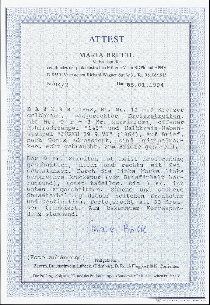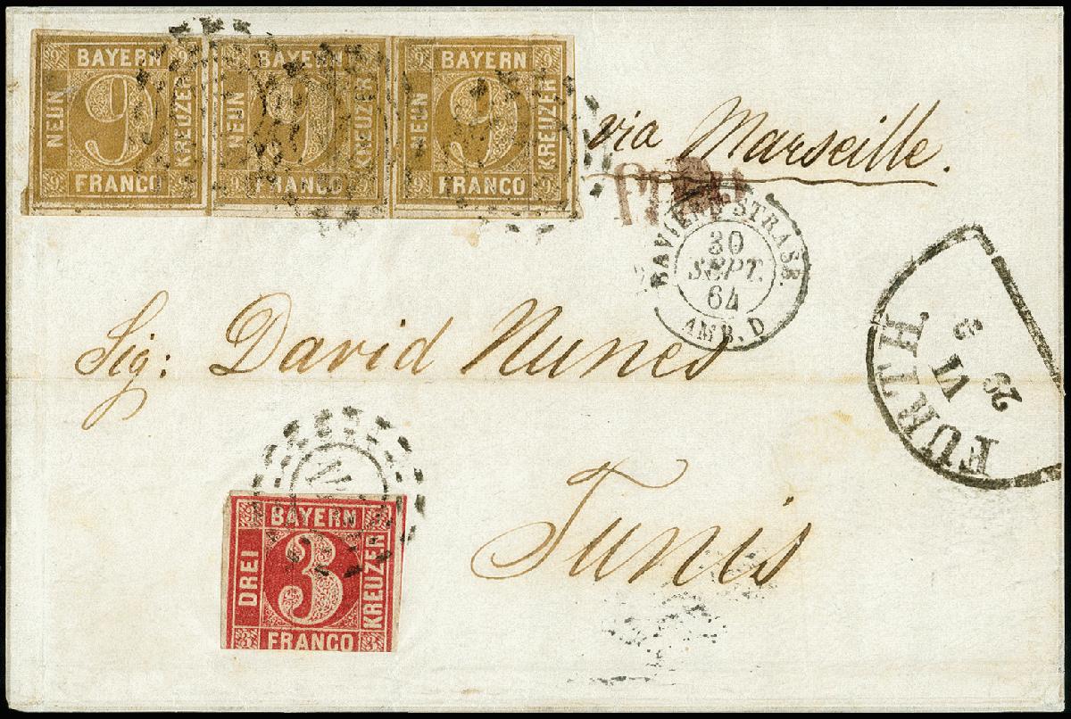 | Zusatzinformationen und Suchstichworte: | 371. Auktion Heinrich Köhler 24.-28. September 2019 Los 8238 TUNESIEN: 1862, 9 Kreuzer ockerbraun im waagerechten 3er-Streifen, voll- bis meist breitrandig zusammen mit unten etwas angeschnittener 3 Kreuzer karminrosa, mit oMR "145" und nebengesetztem Halbkreisstempel "FÜRTH 29 9" (1864) auf komplettem Faltbrief über Frankreich und Algerien nach Tunis mit rückseitigem Transit- und Ankunftsstempel. Die linke Marke des Streifens links schwache Druckspur (vom Briefinhalt herrührend) und kleiner Gummispritzer, sonst tadellos, Ein sehr seltener Brief nach Nordafrika mit seltener Streifeneinheit, die Köhler-Kartei-Registratur nur 3 weitere Briefe der Quadratausgabe nach Tunesien registriert, Fotoattest Brettl BPP (1994) Zuschlag 2.000,00 EUR |