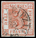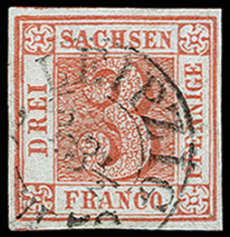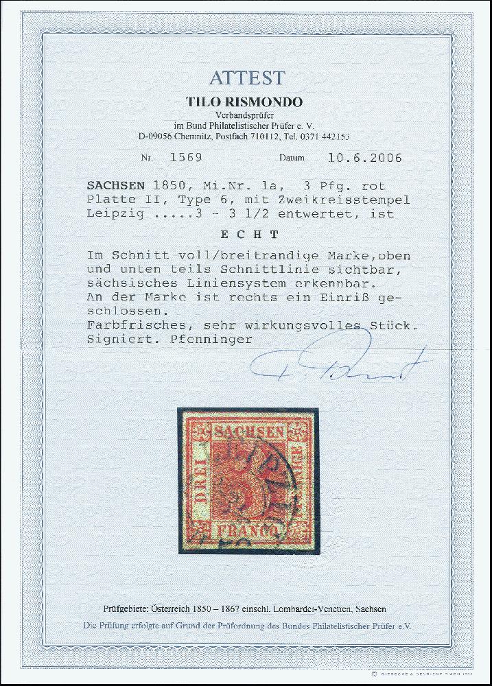 | Zusatzinformationen und Suchstichworte: | 371. Auktion Heinrich Köhler 24.-28. September 2019 Los 8504 3 Pfennige rot, Platte II, Type 6, schöne frische Farbe und allseits gut voll- bis breitrandig, sauber entwertet durch Doppelkreisstempel von Leipzig. Ein kleiner Randriß rechts kunstvoll geschlossen, sonst einwandfrei. Ein insgesamt schönes Stück, signiert Pfenninger und Fotoattest Rismondo BPP (2006) Zuschlag 1.500,00 EUR |