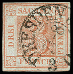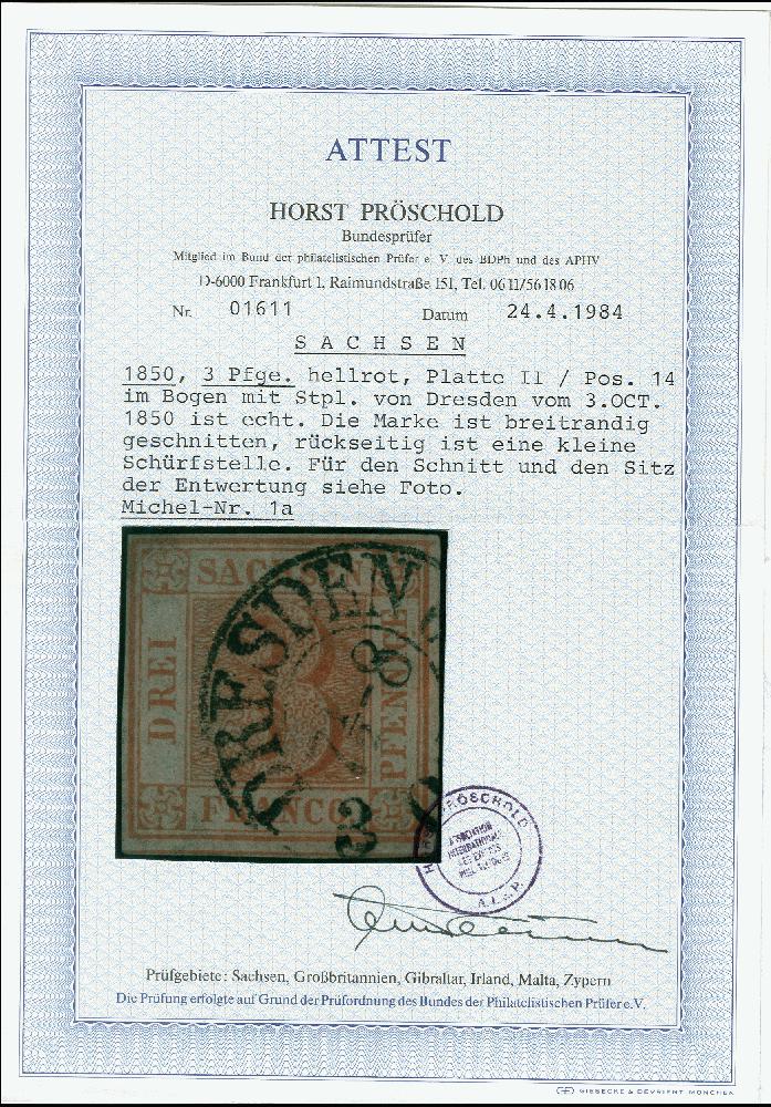 | Zusatzinformationen und Suchstichworte: | 371. Auktion Heinrich Köhler 24.-28. September 2019 Los 8505 3 Pfennige ziegelrot, Platte II,Type 14, farbfrisch und voll- bis breitrandig, unten mit Schnittlinie, daran sächsisches Liniensystem erkennbar, sehr schön entwertet durch sauber aufgesetztem Doppelkreisstempel von Dresden. Rückseitig kleine kaum merkliche Schürfstelle, sonst einwandfrei. Ein schönes Stück. Signiert Starauschek und Schlesinger sowie Fotoatteste Georg Bühler (1974) und Pröschold BPP (1984) Zuschlag 1.900,00 EUR |