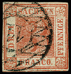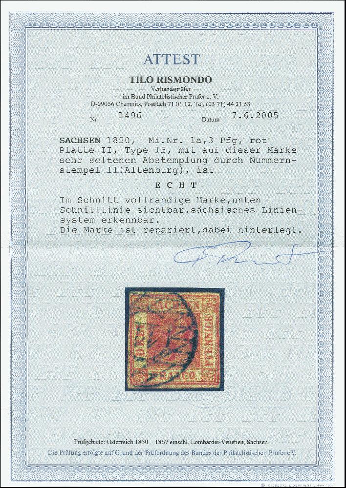 | Zusatzinformationen und Suchstichworte: | 371. Auktion Heinrich Köhler 24.-28. September 2019 Los 8507 3 Pfennige rot, Platte II, Type 15, voll- bis breitrandig, unten mit sichtbarer Schnittlinie, daran sächsisches Liniensystem erkennbar, sauber entwertet mit klar aufgesetztem Nummernstempel "11" ALTENBURG. Die Marke ist Kunstvoll hinterlegt. Nummernstempel-Entwertungen auf der Nr. 1 sind nur in wenigen Exemplare bekannt, von Altenburg hat die Köhler-Kartei-Registratur nur ein weiteres Stück registriert, Fototattest Rismondo BPP (2005) Zuschlag 1.500,00 EUR |