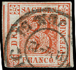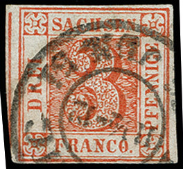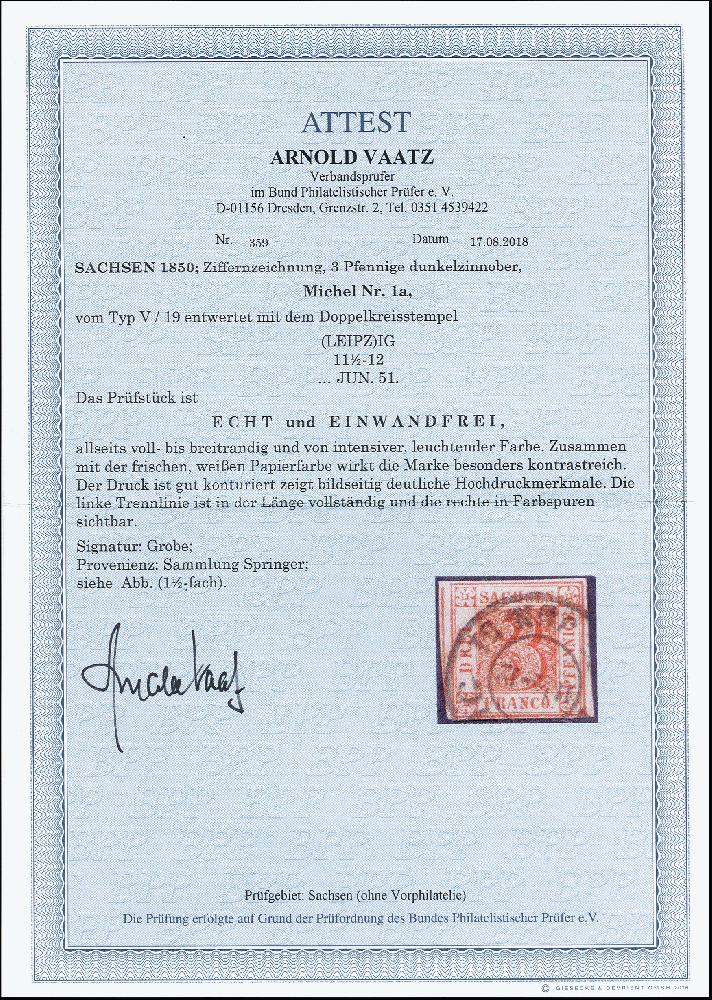| Zusatzinformationen und Suchstichworte: | 371. Auktion Heinrich Köhler 24.-28. September 2019 Los 8515 3 Pfennige dunkelzinnober, Platte V, Type 19, schöne leuchtend frische Farbe und allseits voll- bis überrandig, sauber entwertet durch Doppelkreisstempel von Leipzig, Kabinett, signiert Grobe und Fotoattest Vaatz BPP (2018) Zuschlag 3.400,00 EUR |