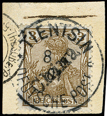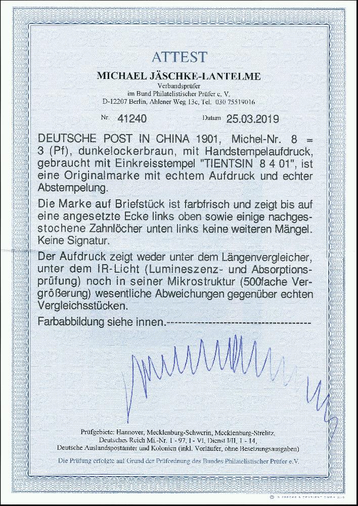 | Zusatzinformationen und Suchstichworte: | 371. Auktion Heinrich Köhler 24.-28. September 2019 Los 1700 3 Pfg. mit Stempel "TIENTSIN DP 8.4.01" auf Briefstück, links oben mit angesetzter Ecke und unten links mit einigen nachgestochenen Zähnungslöchern, sonst tadellos, optisch ansprechendes Exemplar, Fotoattest Jäschke-L. BPP (2011) (Mi. 1.000,-) Zuschlag 120,00 EUR |