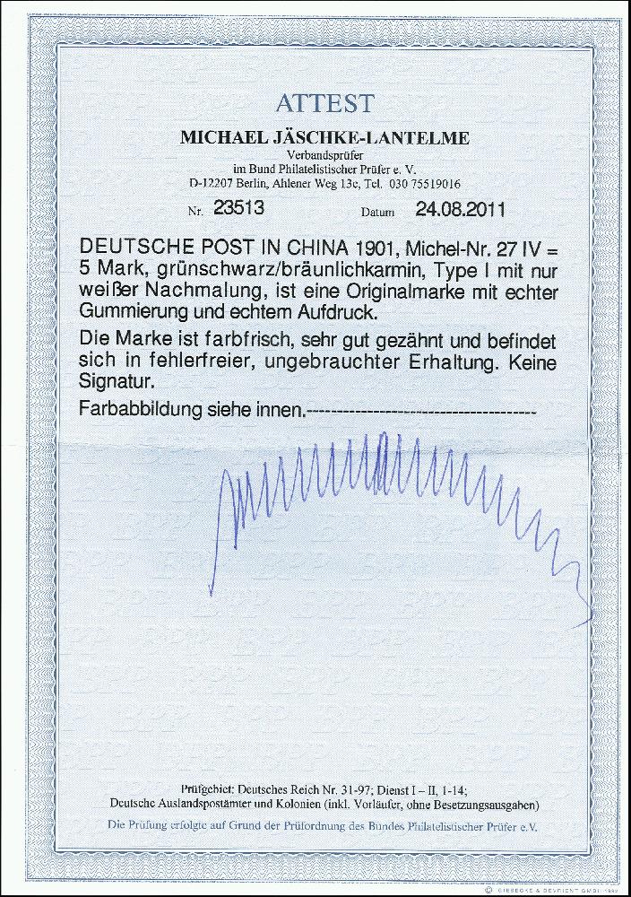 | Prüfer: | Jäschke-Lantelme, Michael (BPP (Bund Philatelistischer Prüfer)) |