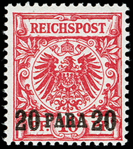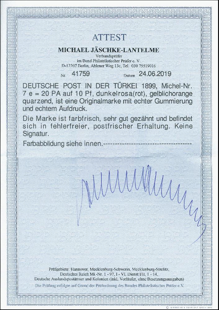 | Zusatzinformationen und Suchstichworte: | 371. Auktion Heinrich Köhler 24.-28. September 2019 Los 1724 1899, 20 PARA auf 10 Pfg. dunkelrosa, gelblichorange quarzend, postfrisch, tadellos, unsign., Fotoattest Jäschke-L. BPP (2019) (Mi. 1.500,-) Ausruf 400,00 EUR |