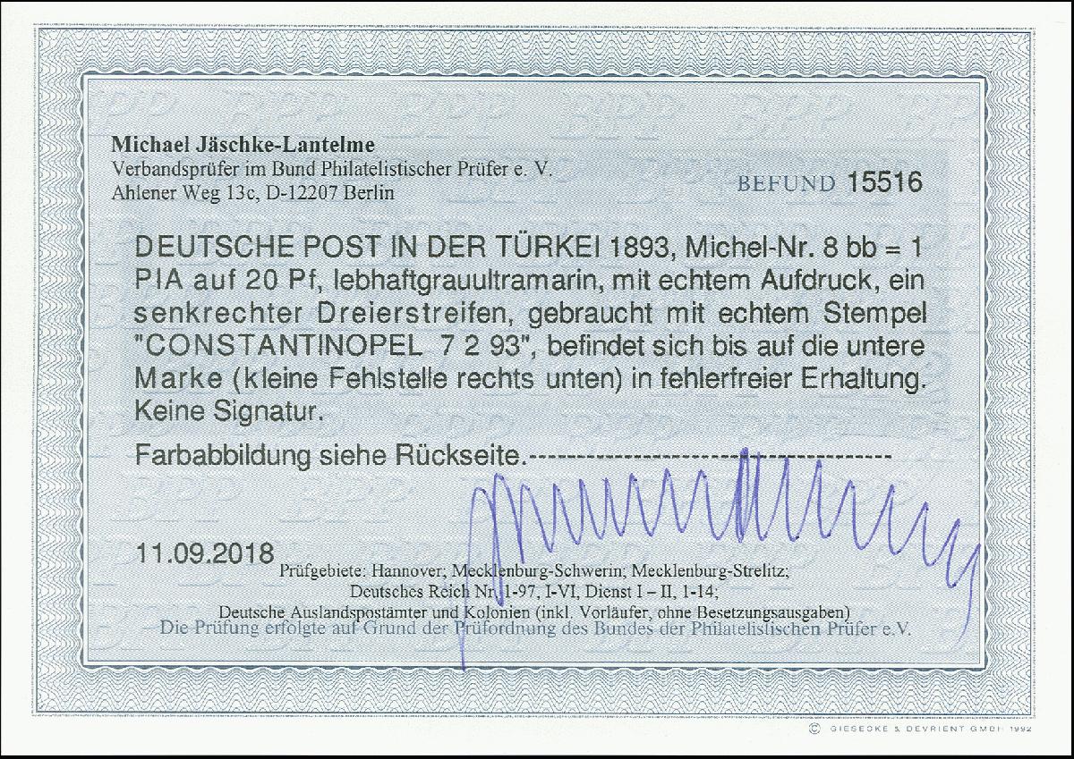 | Prüfer: | Jäschke-Lantelme, Michael (BPP (Bund Philatelistischer Prüfer)) |