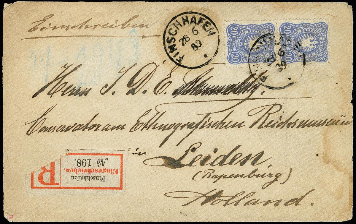 | Zusatzinformationen und Suchstichworte: | 371. Auktion Heinrich Köhler 24.-28. September 2019 Los 1730 20 Pfg. ultramarin im senkrechten Paar mit EKr. "FINSCHHAFEN 28 6 89", zusätzlich nebengesetzt, auf R-Brief an den Kurator des Ethnischen Museums in Leiden, Niederlande, mit Ankunftsstempelvom 23.8.. Der Familienname in der Anschrift gestrichen und übliche Beförderungsspuren, insgesamt gute Bedarfserhaltung. Ein sehr seltener früher R-Brief, insbesondere mit der Destination außerhalb des Deutschen Reiches. Attest R.F. Steuer BPP(1995) Ausruf 1.600,00 EUR |