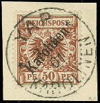 | Zusatzinformationen und Suchstichworte: | 371. Auktion Heinrich Köhler 24.-28. September 2019 Los 1768 50 Pfg. lebhaftrötlichbraun, farbfrisch mit Stempel "YAP 3.4.01" auf Briefstück, Eckzahn links oben winzig hell, sonst tadellos, sehr dekoratives Exemplar dieser nicht häufigen Marke, Fotoattest Jäschke-L. BPP (2019) (Mi. 1.800,-) Ausruf 300,00 EUR |