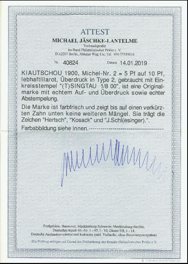 | Zusatzinformationen und Suchstichworte: | 371. Auktion Heinrich Köhler 24.-28. September 2019 Los 1772 5 Pf. auf 10 Pfg., Type 2, farbfrisch mit Stempel "TSINGTAU KIAUTSCHOU *a 1.8.00", unten mit leicht verkürztem Zahn, sonst tadellos, seltene Marke, mehrfach sign. und Fotoattest Jäschke-L. BPP (2019) (Mi. 5.000,-) Zuschlag 800,00 EUR |