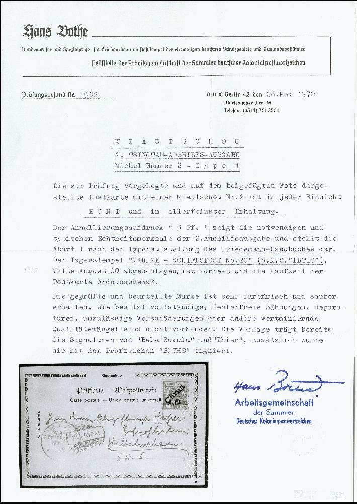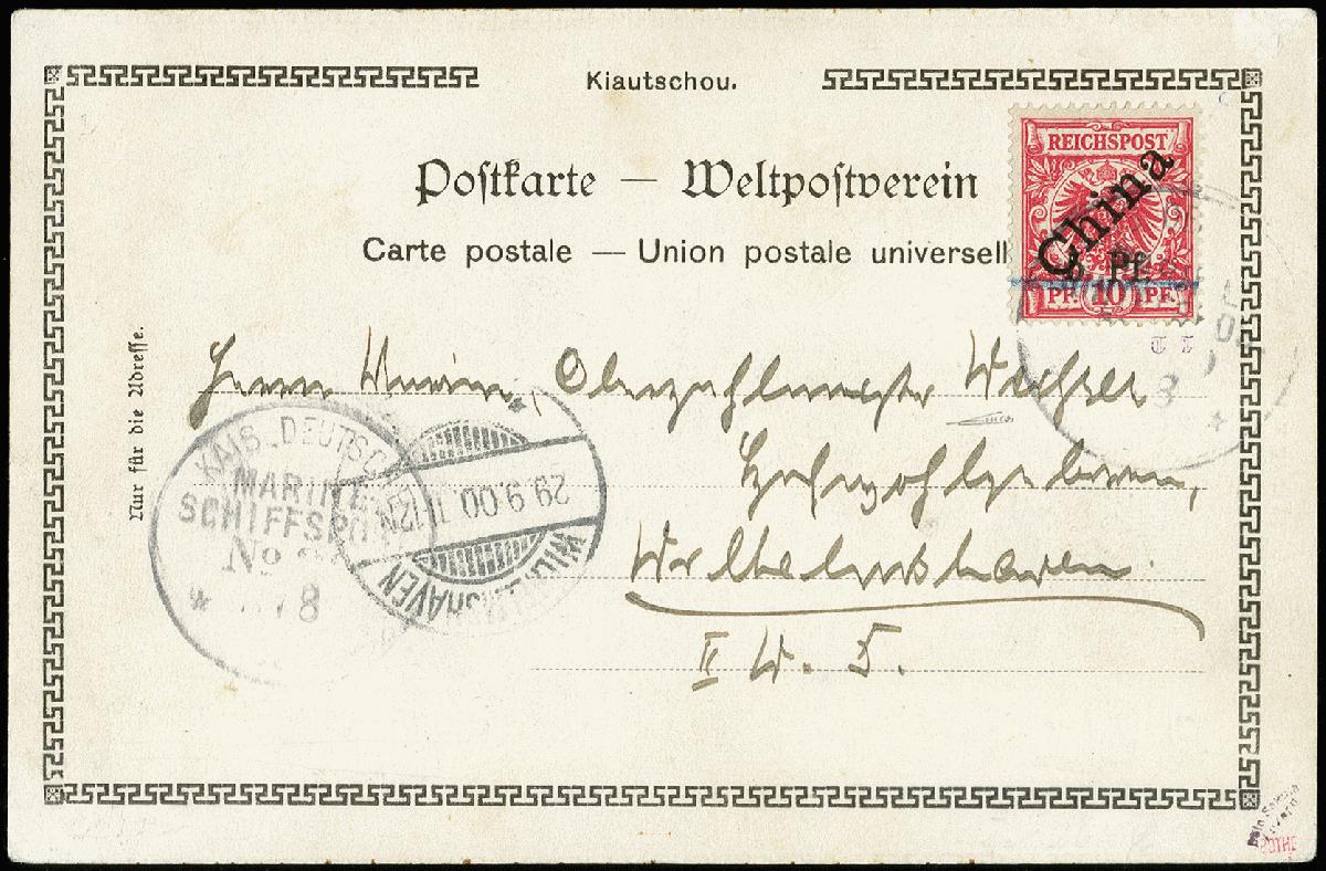 | Zusatzinformationen und Suchstichworte: | 371. Auktion Heinrich Köhler 24.-28. September 2019 Los 1773 5 Pf. a.10 Pfg. auf Ansichtskarte ("Tsingtau Chinesenhütte") gestempelt "KAIS. DEUTSCHE MARINE-SCHIFFSPOST Nr.20 (1?)/8 (00)" an Oberzahlmeister in Wilhelmshaven mit Ankunftsstempel vom 29.9.00; die Marke ist farbfrisch und gut gezähnt, Pracht, sign. Bela Sekula, Bothe, Thier, AG Berlin sowie Fotoatteste Bothe (1970) und Jäschke-Lantelme BPP 2009) (Mi. 10.000,-) Zuschlag 2.250,00 EUR |
