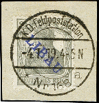 | Zusatzinformationen und Suchstichworte: | 371. Auktion Heinrich Köhler 24.-28. September 2019 Los 1812 2½ Pfg. mit violettblauem Aufdruck, sauber mit Stempel "K.D. Feldpostation -4.1.19" auf Briefstück, tadellos, sign. und Fotoattest Huylmans BPP (2019) (Mi. 500,-) Zuschlag 260,00 EUR |