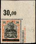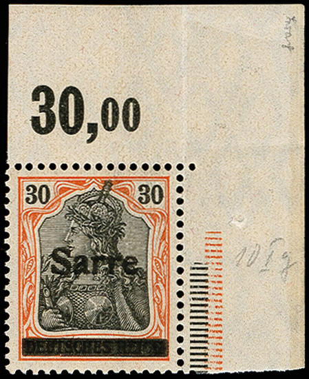 | Zusatzinformationen und Suchstichworte: | 371. Auktion Heinrich Köhler 24.-28. September 2019 Los 1834 30 Pfennig dunkelrotorange/schwarz auf orangeweiß aus der rechten oberen Bogenecke mit Plattendruck-Oberrand, postfrisch, rechter Rand fast komplett angetrennt und Bleistiftbeschriftung, Marke mit Oberrand tadellos, unsigniert mit Fotoattest Braun BPP (2015) (Mi. 900,-) Ausruf 150,00 EUR |