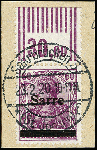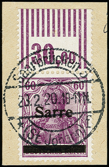 | Zusatzinformationen und Suchstichworte: | 371. Auktion Heinrich Köhler 24.-28. September 2019 Los 1838 60 Pfennig purpurlila mit Walzendruck-Oberrand, sauber mit Stempel "Saarbrücken 3 (St. Johann) 23.3.20" auf Briefstück, tadellos, doppelt signiert Burger BPP mit Fotoattest (2005) (Mi. -,-) Zuschlag 360,00 EUR |