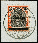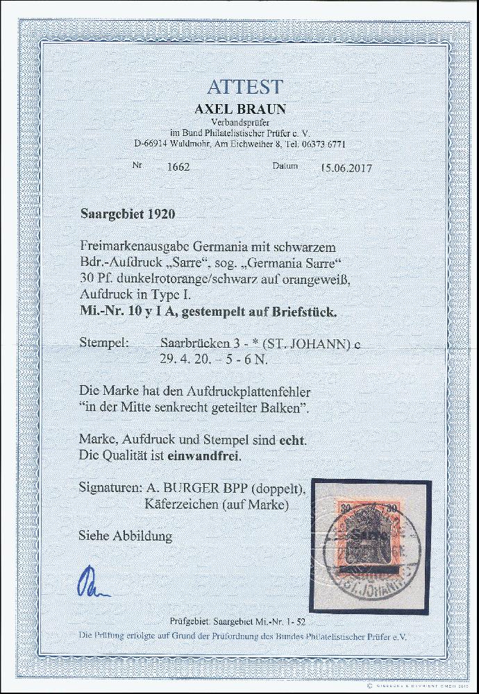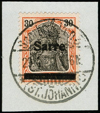 | Zusatzinformationen und Suchstichworte: | 371. Auktion Heinrich Köhler 24.-28. September 2019 Los 1845 30 Pfennig dunkelrotorange/schwarz auf orangeweiß mit Stempel "Saarbrücken 3 (ST. JOHANN) 29.4.20" auf Briefstück, tadellos, doppelt signiert Burger BPP und Fotoattest Braun BPP (2017) Ausruf 150,00 EUR |