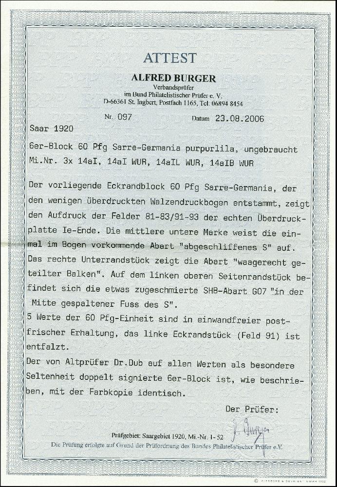 | Prüfgebiet: | Saargebiet (Mi-Nr. 1 - 205) |