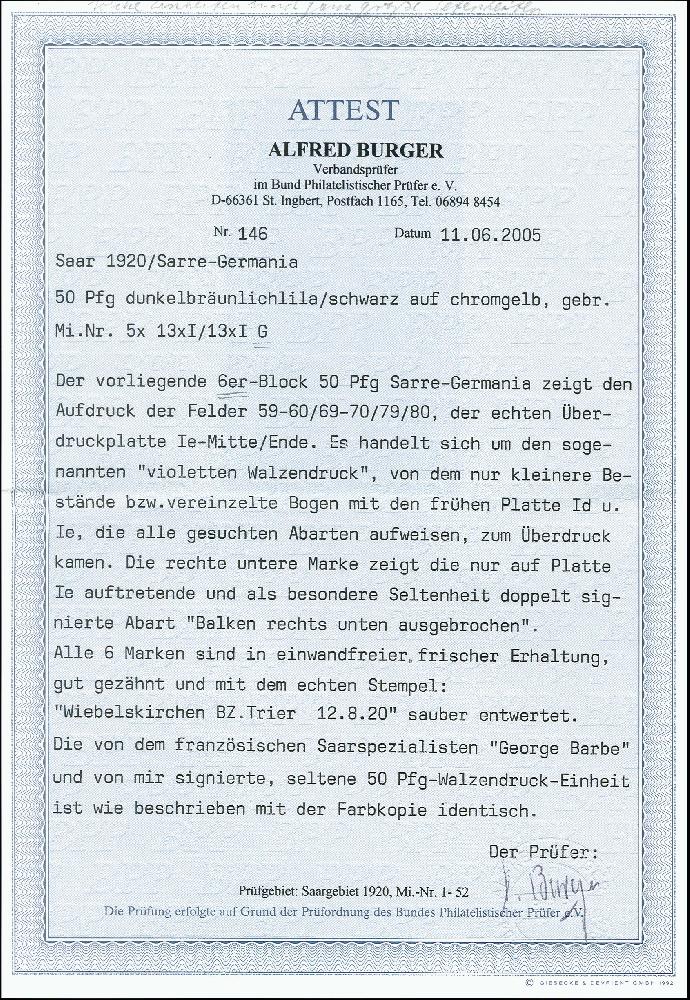 | Prüfgebiet: | Saargebiet (Mi-Nr. 1 - 205) |
