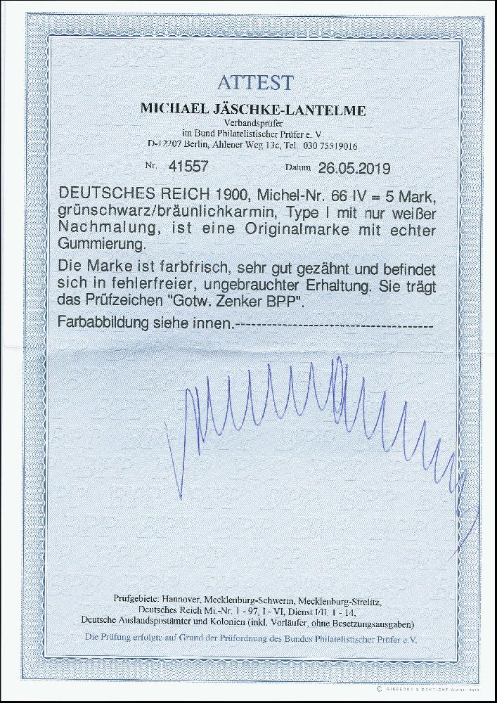 | Prüfer: | Jäschke-Lantelme, Michael (BPP (Bund Philatelistischer Prüfer)) |