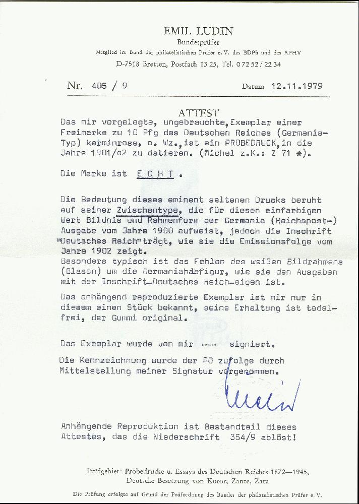 | Prüfer: | Ludin, Emil (BPP (Bund Philatelistischer Prüfer)) |