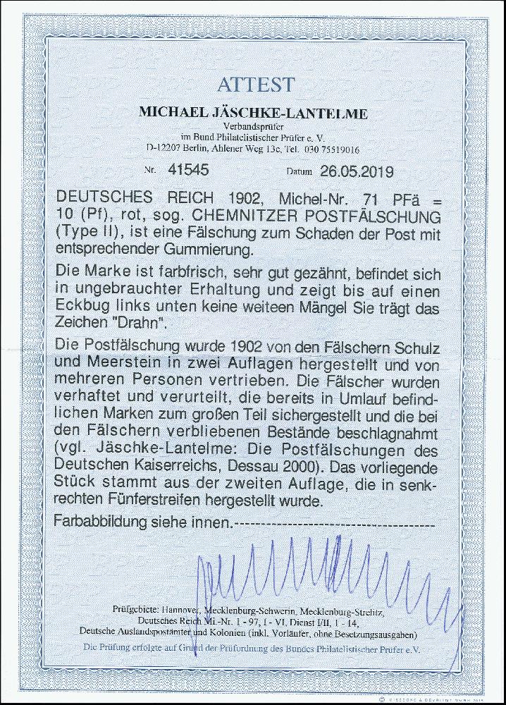 | Zusatzinformationen und Suchstichworte: | 371. Auktion Heinrich Köhler 24.-28. September 2019 Los 7049 10 Pfennig rot als sogenannte Chemnitzer Postfälschung, Type II, ungebraucht, tadellos, signiert Drahn und Fotoattest Jäschke-L. BPP (2019) (Mi. 1.000,-) Zuschlag 280,00 EUR |