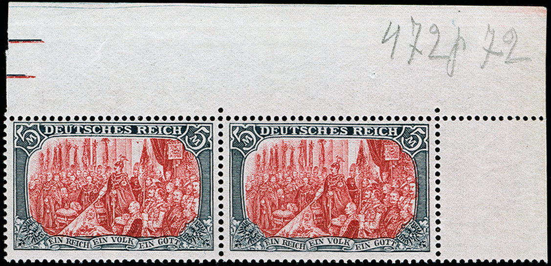 | Zusatzinformationen und Suchstichworte: | 371. Auktion Heinrich Köhler 24.-28. September 2019 Los 7059 5 Mark grünschwarz/dunkelkarmin, Mittelstück gelblichrot quarzend, im waagerechten Paar aus der rechten oberen Bogenecke, postfrisch, tadellos, im Seitenrand etwas angetrennt, seltene Einheit, unsigniert mit Fotoatteste Zenker BPP (1989 für Viererblock) und Jäschke-L. BPP (2019) (Mi. 1.800,-+) Zuschlag 450,00 EUR |