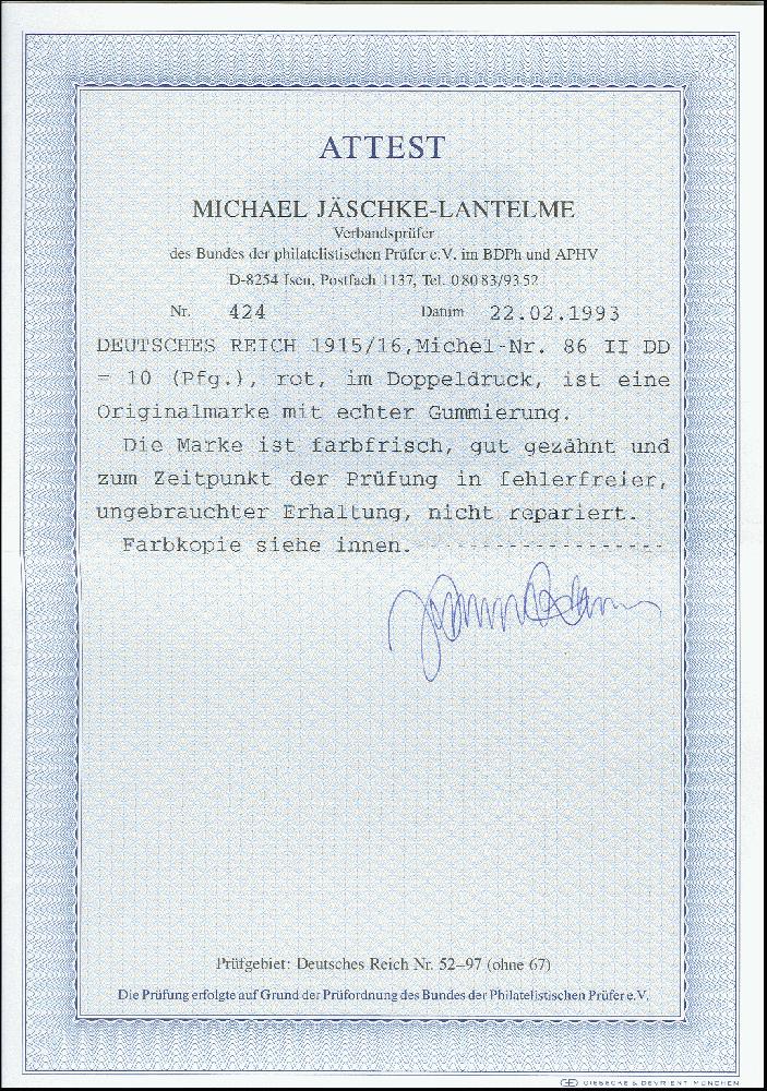 | Prüfer: | Jäschke-Lantelme, Michael (BPP (Bund Philatelistischer Prüfer)) |