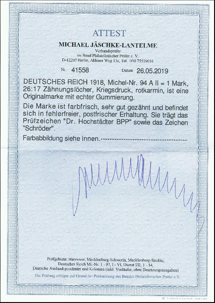 | Prüfer: | Jäschke-Lantelme, Michael (BPP (Bund Philatelistischer Prüfer)) |