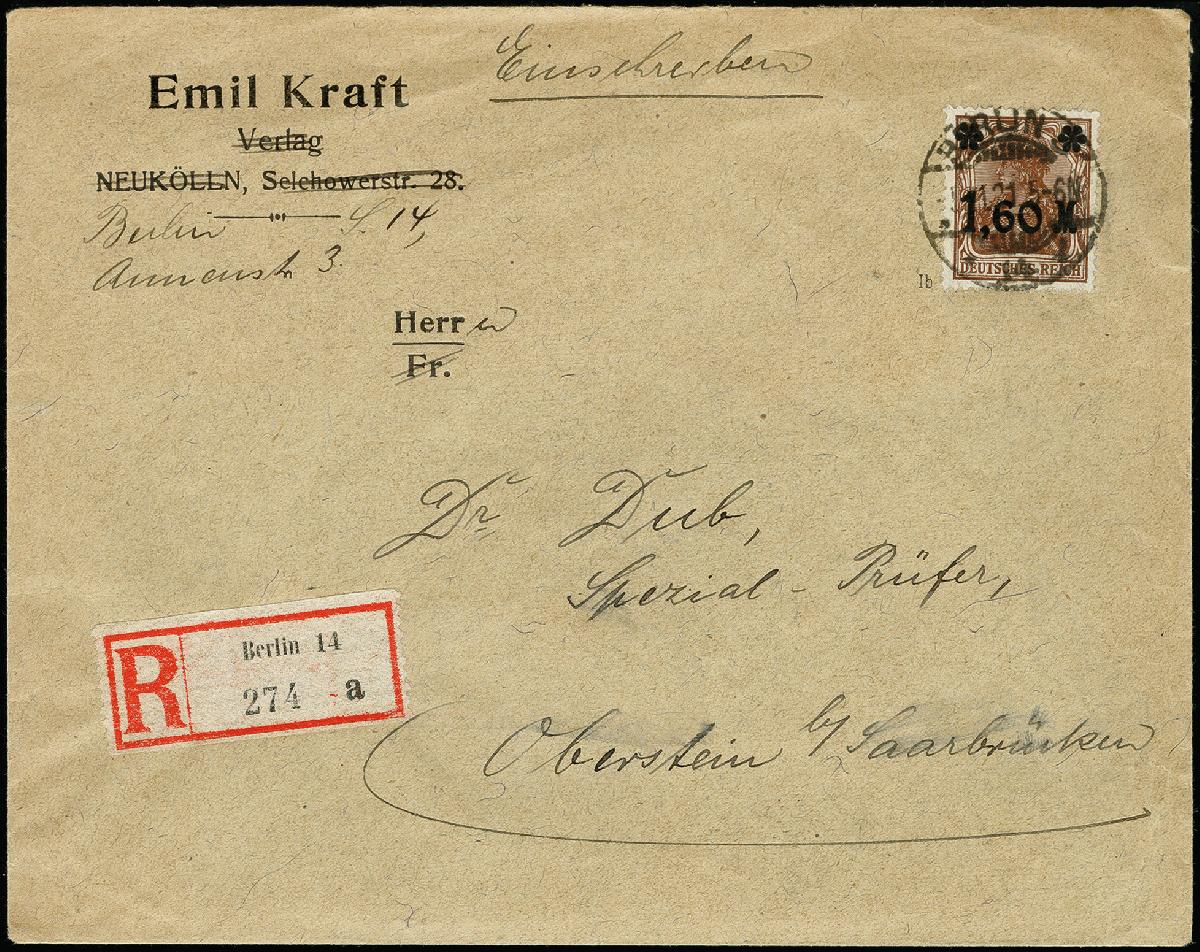 | Zusatzinformationen und Suchstichworte: | 371. Auktion Heinrich Köhler 24.-28. September 2019 Los 7135 1,60 M. auf 5 Pfennig braun mit mattglänzendem Aufdruck als portogerechte Einzelfrankatur auf R-Brief von "BERLIN 5.11.21" nach Oberstein bei Saarbrücken mit Ankunftsstempel, tadellos, signiert Dr. Hochstädter BPP und Fotoattest Weinbuch BPP (2019) (Mi. 1.200,-) Zuschlag 300,00 EUR |