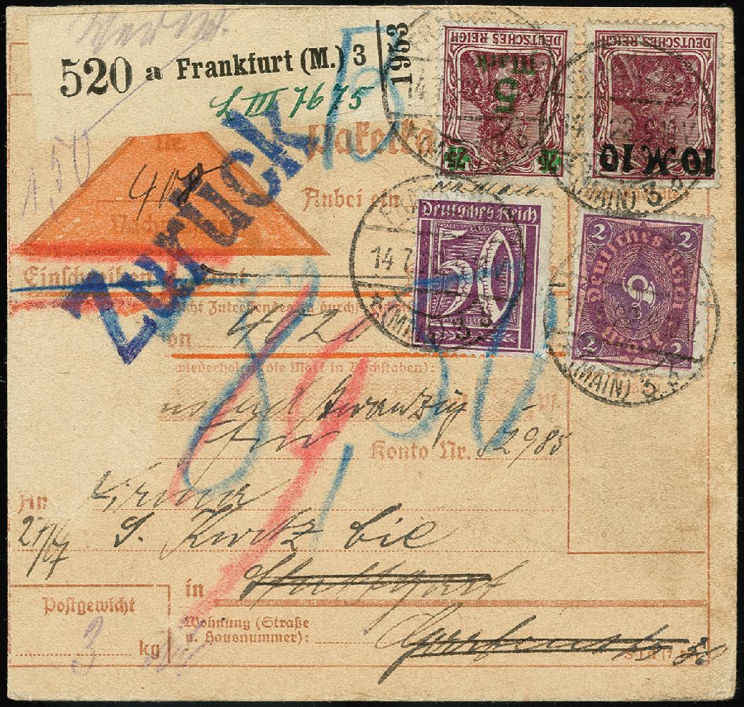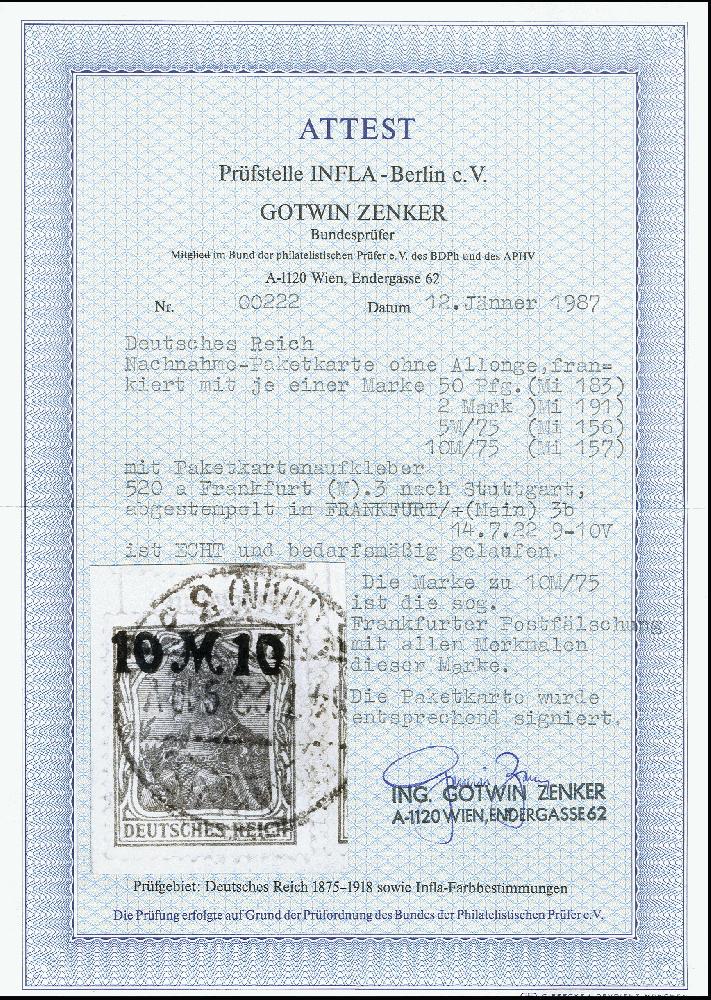 | Zusatzinformationen und Suchstichworte: | 371. Auktion Heinrich Köhler 24.-28. September 2019 Los 7141 Postfälschung 10 M. auf 75 Pfennig mit Stempel "FRANKFURT (MAIN) 3 14.7.22" auf R-Nachnahme-Paketkarte mit portogerechter Zufrankatur nach Stuttgart, rückseitig mit zwei Werten Schnitter 1,50 Mark orange mit handschriftlichem Datum "17.7." bzw. "19.7." für die Postlagergebühren, danach Rücksendung mit handschriftlichem Tax-Vermerk sowie Ankunftsstempel "FRANKFURT 9 30.7.23" und aptiertem Stempel "FRANKFURT 9 PORTO", Formular vorderseitig mit größerer Haftstelle und ein Wert rückseitig mit Eckfehler, die Postfälschung selber in tadelloser Erhaltung, in dieser Kombination sehr selten, signiert Infla Berlin und Zenker BPP mit Fotoattest (1987) und Fotoattest Weinbuch BPP (2019) (Mi. 4.000,-) Zuschlag 800,00 EUR |