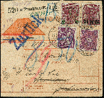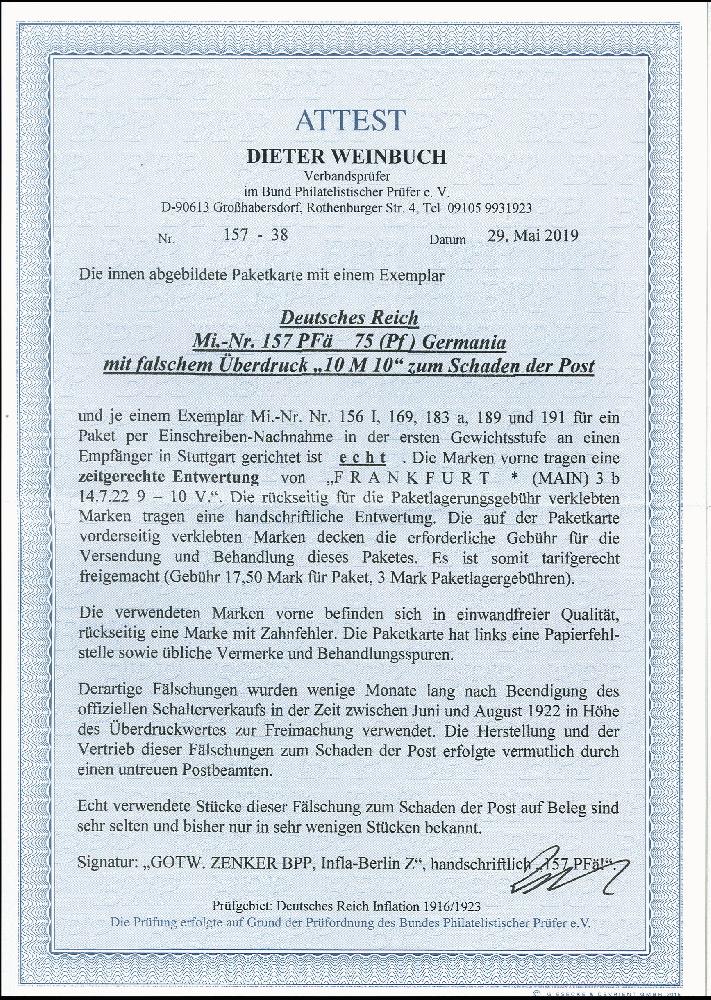 | Zusatzinformationen und Suchstichworte: | 371. Auktion Heinrich Köhler 24.-28. September 2019 Los 7141 Postfälschung 10 M. auf 75 Pfennig mit Stempel "FRANKFURT (MAIN) 3 14.7.22" auf R-Nachnahme-Paketkarte mit portogerechter Zufrankatur nach Stuttgart, rückseitig mit zwei Werten Schnitter 1,50 Mark orange mit handschriftlichem Datum "17.7." bzw. "19.7." für die Postlagergebühren, danach Rücksendung mit handschriftlichem Tax-Vermerk sowie Ankunftsstempel "FRANKFURT 9 30.7.23" und aptiertem Stempel "FRANKFURT 9 PORTO", Formular vorderseitig mit größerer Haftstelle und ein Wert rückseitig mit Eckfehler, die Postfälschung selber in tadelloser Erhaltung, in dieser Kombination sehr selten, signiert Infla Berlin und Zenker BPP mit Fotoattest (1987) und Fotoattest Weinbuch BPP (2019) (Mi. 4.000,-) Zuschlag 800,00 EUR |