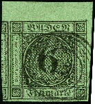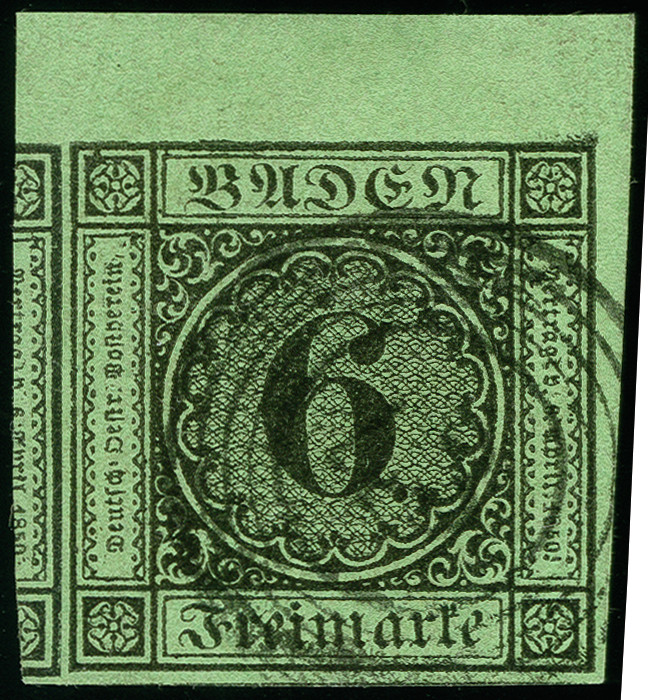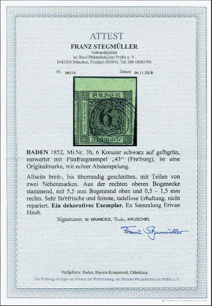 | Zusatzinformationen und Suchstichworte: | 374. Auktion Heinrich Köhler Auktionstermin 27.06.2020 Los 4 6 Kreuzer schwarz auf gelbgrün, rechte obere Bogenecke, sehr schöne frische Farbe und allseits breit- bis überrandig, links mit größerem Teil der Nachbarmarke, rechts mit schmalem und oben mit 5,5 mm Bogenrand, sauber entwertet durch Nummer "43" von Freiburg. Ein Ausnahmestück dieser Marke in erstklassiger Erhaltung. Signiert Drahn, Brandes und Kruschel, Fotoattest Stegmüller BPP (2018) (Mi.-Nr. 3b) Ausruf 200,00 EUR Zuschlag 320,00 EUR (aus der Sammlung Erivan Haub) |