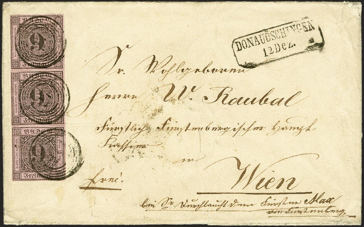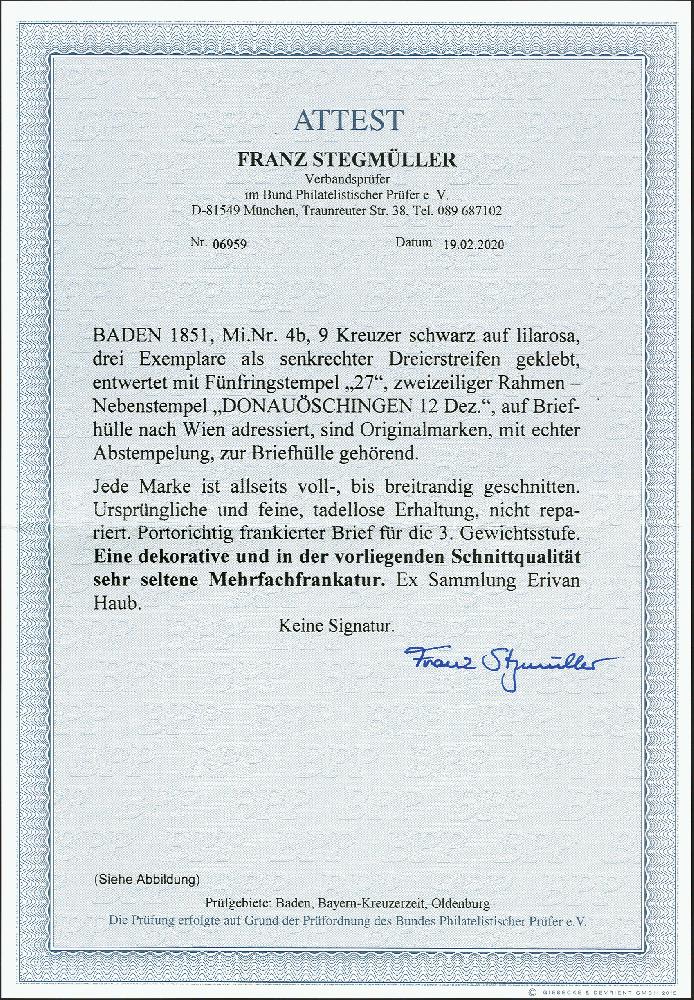 | Zusatzinformationen und Suchstichworte: | 374. Auktion Heinrich Köhler Auktionstermin 27.06.2020 Los 7 9 Kreuzer schwarz auf lilarosa, 3 Einzelstücke als senkrechter Streifen geklebt, alle farbfrisch und voll- bis breitrandig mit Nummer "27" und nebengesetztem Rahmenstempel "DONAUÖSCHINGEN 12 Dez." auf Briefhülle der 3. Gewichtsstufe nach Wien mit rückseitigem Ankunftsstempel. Eine seltene Mehrfachfrankatur im Postverein. Fotoattest Stegmüller BPP (2020) (Mi.-Nr. 4b) Ausruf 800,00 EUR Zuschlag 2.400,00 EUR (aus der Sammlung Erivan Haub) |
