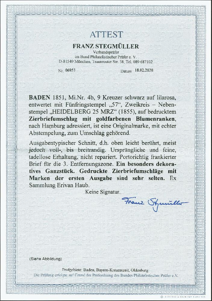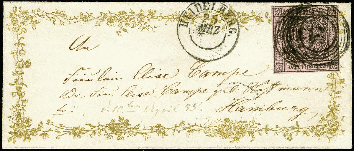 | Zusatzinformationen und Suchstichworte: | 374. Auktion Heinrich Köhler Auktionstermin 27.06.2020 Los 8 1851, 9 Kreuzer schwarz auf lilarosa, oben leicht berührt, sonst voll- bis breitrandig, mit zweimal aufgesetzter Nummer "57" und sauber nebengesetztem kleinen Doppelkreisstempel "HEIDELBERG 25 MRZ." (1855) auf kleinem, mit goldfarbenen Blumenranken bedrucktem Zierkuvert an die gleichnamige Tochter der Schriftstellerin Elise Campe nach Hamburg mit Durchgangsstempel von Frankfurt und Ankunftsstempel. Ein ebenso schöner wie seltener Brief in tadelloser Erhaltung. Fotoattest Stegmüller BPP (2020) (Mi.-Nr. 4b) Ausruf 1.000,00 EUR Zuschlag 1.000,00 EUR (aus der Sammlung Erivan Haub) |
