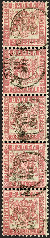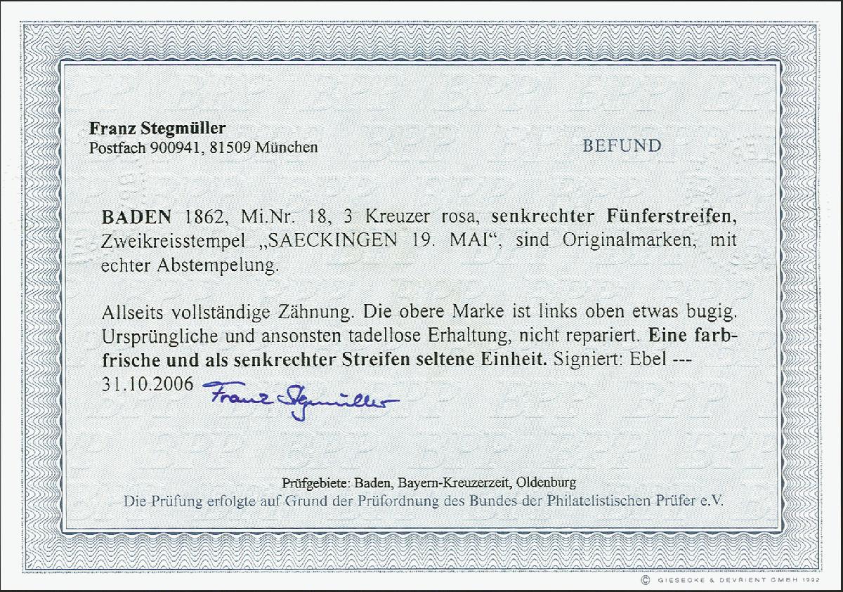| Zusatzinformationen und Suchstichworte: | 374. Auktion Heinrich Köhler Auktionstermin 27.06.2020 Los 13 1862, Wappenausgabe gezähnt 10, 3 Kreuzer rosa im senkrechten 5er-Streifen, farbfrisch und gut gezähnt, die obere Marke oben ganz gering bügig, sonst einwandfrei, mit Doppelkreisstempel "SAECKINGEN 19. MAI". Eine außerordentlich seltene Streifeneinheit. Signiert Ebel und Fotobefund Stegmüller BPP (2006) (Mi.-Nr. 18) Ausruf 400,00 EUR Zuschlag 650,00 EUR (aus der Sammlung Erivan Haub) |