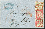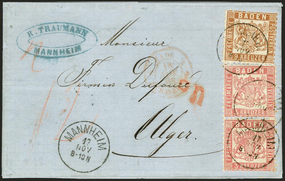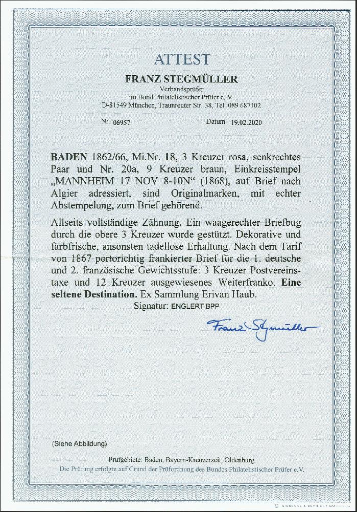 | Zusatzinformationen und Suchstichworte: | 374. Auktion Heinrich Köhler Auktionstermin 27.06.2020 Los 15 1862/66, 9 Kreuzer braun und senkrechtes Paar 3 Kreuzer rosa, alle farbfrisch und gut gezähnt mit leicht auf- und sauber nebengesetztem Einkreisstempel "MANNHEIM 17 NOV" (1868) auf komplettem Faltbrief der 1. deutschen und 2. französischen Gewichtsstufe nach Algerien mit Transit- und Ankunftsstempeln. Ein unauffälliger Briefbug durch die obere 3 Kreuzer-Marke von hinten gestützt, sonst einwandfrei. Ein attraktiver Brief mit seltener Destination. Signiert Englert BPP und Fotoattest Stegmüller BPP (2020) (Mi.-Nr. 20a, 18) Ausruf 1.000,00 EUR Zuschlag 1.600,00 EUR (aus der Sammlung Erivan Haub) |