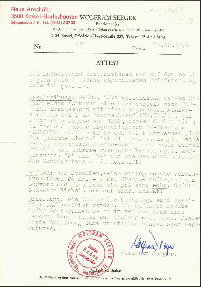| Zusatzinformationen und Suchstichworte: | 374. Auktion Heinrich Köhler Auktionstermin 27.06.2020 Los 17 1871, Letzte Wappenausgabe, 7 Kreuzer hellblau im waagerechten 5er-Streifen, farbfrisch und allseits gut gezähnt, lediglich die rechte Marke am rechten Rand beförderungsbedingt leicht bestoßen, sehr schön entwertet mit drei sauberen Abschlägen des Einkreisstempels "CARLSRUHE STADT-POST 25 OCT." (1871) auf Chargé-Briefkuvert der 2. Gewichtsstufe nach Lubar in Rußland mit ausführlichem Leitvermerk "Wien-Krakau-Lemberg-Brody-Radiwillow-Starykonstantynow-Lubar"; vorder- und rückseitig Transit- und Ankunftsstempel (julianischer Kalender). Eine einmalige Mehrfachfrankatur und die größte bekannte gebrauchte Einheit der hellblauen 7 Kreuzer-Marke. Signiert Unverferth mit Befund (1967), Fotoattest Seger BPP (1978) und Fotoattest Stegmüller BPP (2020) (Mi.-Nr. 25b) Ausruf 5.000,00 EUR Zuschlag 55.000,00 EUR (aus der Sammlung Erivan Haub) |