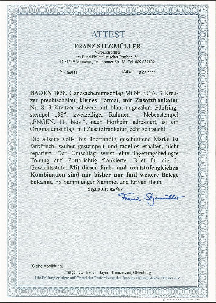 | Zusatzinformationen und Suchstichworte: | 374. Auktion Heinrich Köhler Auktionstermin 27.06.2020 Los 18 1858, Ganzsachenumschlag 3 Kreuzer preußischblau im Kleinformat mit Zufrankatur 1858, 3 Kreuzer schwarz auf blau, voll- bis überrandig, links mit Teil der Nachbarmarke, mit sauber übergehend aufgesetzter Nummer "38" und nebengesetztem Rahmenstempel "ENGEN 11 Nov." nach Horheim. Der Umschlag lagerungsbedingte Tönung, die Marke einwandfrei. Eine seltene wertstufengleiche Kombination, von der nur 5 weitere Belege registriert sind. Signiert Englert BPP mit Fotoattest (1985), Fotoattest Stegmüller BPP (2020) (Mi.-Nr. U1A+8) Ausruf 300,00 EUR Zuschlag 600,00 EUR (aus der Sammlung Erivan Haub) |