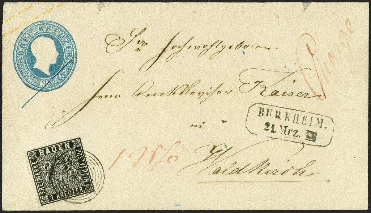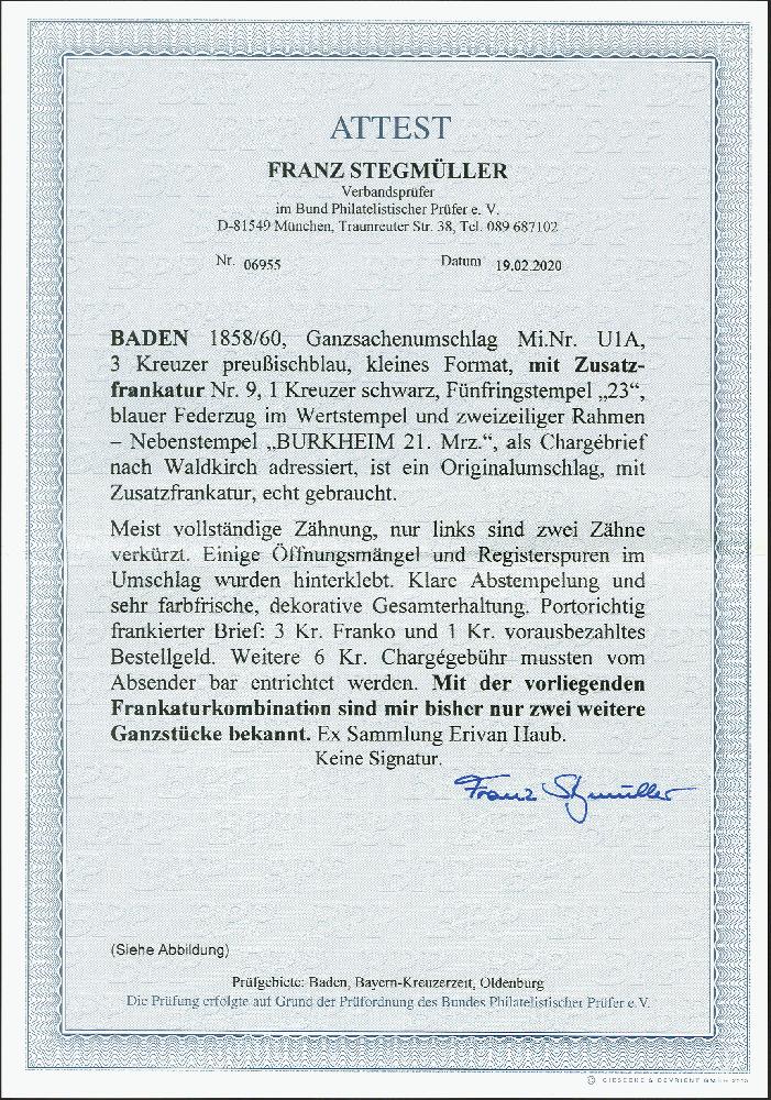 | Zusatzinformationen und Suchstichworte: | 374. Auktion Heinrich Köhler Auktionstermin 27.06.2020 Los 19 Umschlag 3 Kreuzer preußischblau im Kleinformat mit Zufrankatur 1860/61, 1 Kreuzer schwarz in schöner tiefer Farbe und bis auf 2 leicht verkürzte Zähne einwandfrei gezähnt, mit klar aufgesetzter Nummer "23" und sauber nebengesetztem Rahmenstempel "BURKHEIM 21 Mrz." als Chargé-Brief nach Waldkirch mit rückseitigem Bahnpost- und Ankunftsstempeln. Die zufrankierte 1 Kreuzer ist das vorausbezahlte Bestellgeld, weitere 6 Kreuzer Chargé-Gebühr mussten vom Absender bar entrichtet werden. Der Umschlag unauffällige Öffnungs- und Registerspuren, sonst einwandfrei. Eine äußerst dekorative und seltene Frankaturkombination, es sind nur 2 weitere registriert. Fotoattest Stegmüller BPP (2020) (Mi.-Nr. U1A+9) Ausruf 800,00 EUR Zuschlag 800,00 EUR (aus der Sammlung Erivan Haub) |