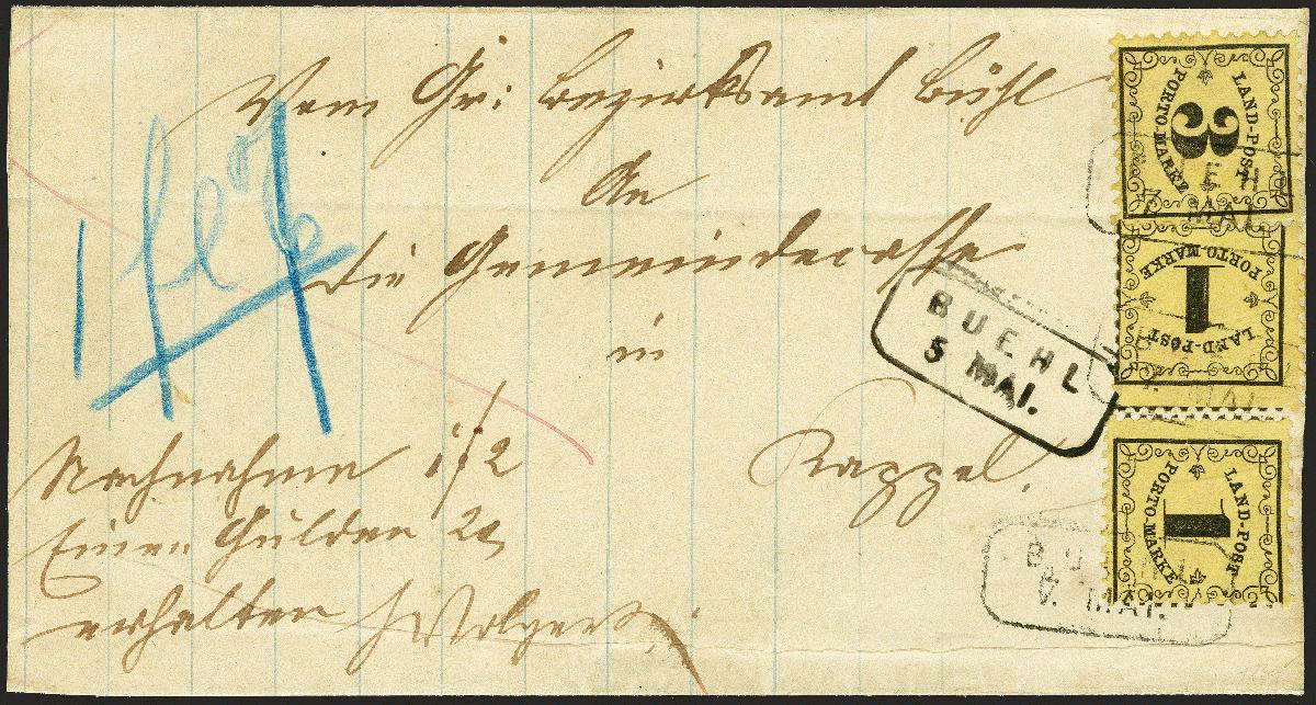 | Zusatzinformationen und Suchstichworte: | 374. Auktion Heinrich Köhler Auktionstermin 27.06.2020 Los 21 3 Kreuzer schwarz auf gelb mit Plattenfehler "E verstümmelt" und 2 Einzelwerte 1 Kreuzer schwarz auf gelb, alle dünnes Papier, mit aufgesetztem Rahmenstempel "BUEHL 7. MAI." (1869) auf Nachnahme-Briefhülle (Seitenklappen fehlend) nach Kappel mit vorher abgeschlagenem "BUEHL 5 MAI.". Ein leichter waagerechter Briefbug beeinträchtigt die Frankatur nicht. Eine attraktive und seltene Frankatur. Fotoattest Englert BPP (1984) (Mi.-Nr. LP2IIx, 1x) Ausruf 500,00 EUR Zuschlag 700,00 EUR (aus der Sammlung Erivan Haub) |