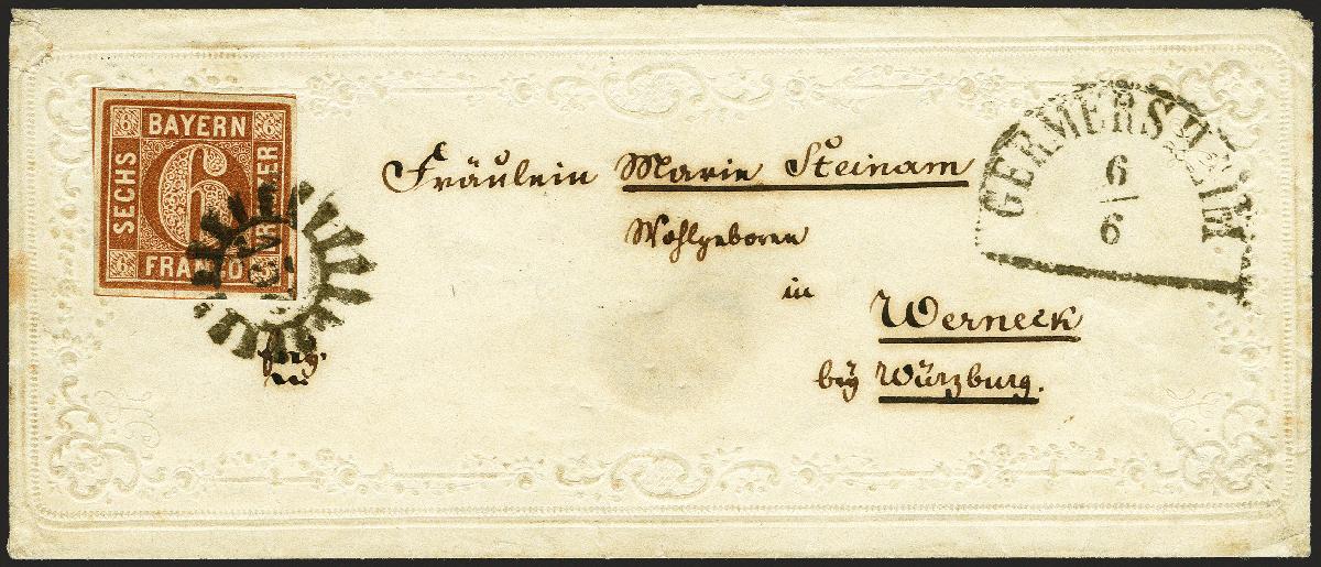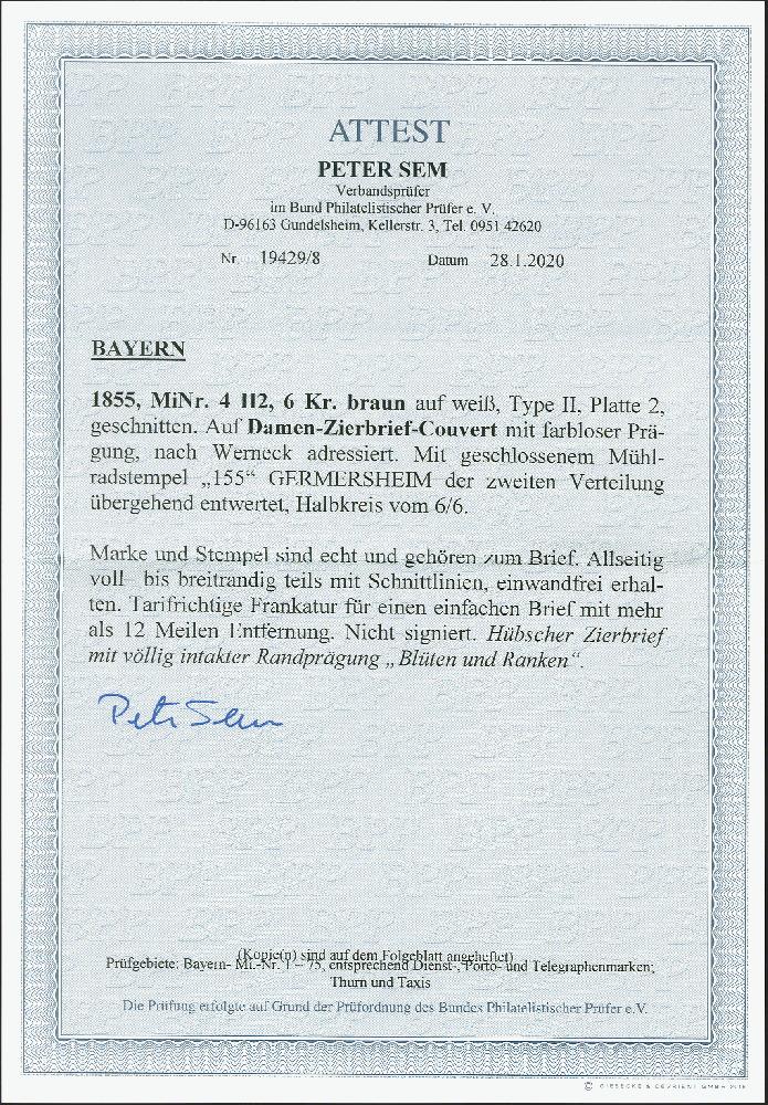 | Zusatzinformationen und Suchstichworte: | 374. Auktion Heinrich Köhler Auktionstermin 27.06.2020 Los 28 6 Kreuzer braun, farbfrisch und voll- bis breitrandig, teils mit Schnittlinien, mit geschlossenem Mühlradstempel "155" und sauber nebengesetztem Halbkreisstempel "GERMERSHEIM 6/6" auf kleinem Damenbrief mit prachtvoll geprägter Zierborde nach Werneck bei Würzburg. Rückseitiges Siegel beim Öffnen größtenteils entfernt, minimale Öffnungsmängel. Ein sehr dekorativer Zierbrief in einwandfreier Erhaltung. Fotoattest Sem BPP (2020) (Mi.-Nr. 4II) Ausruf 300,00 EUR Zuschlag 420,00 EUR (aus der Sammlung Erivan Haub) |